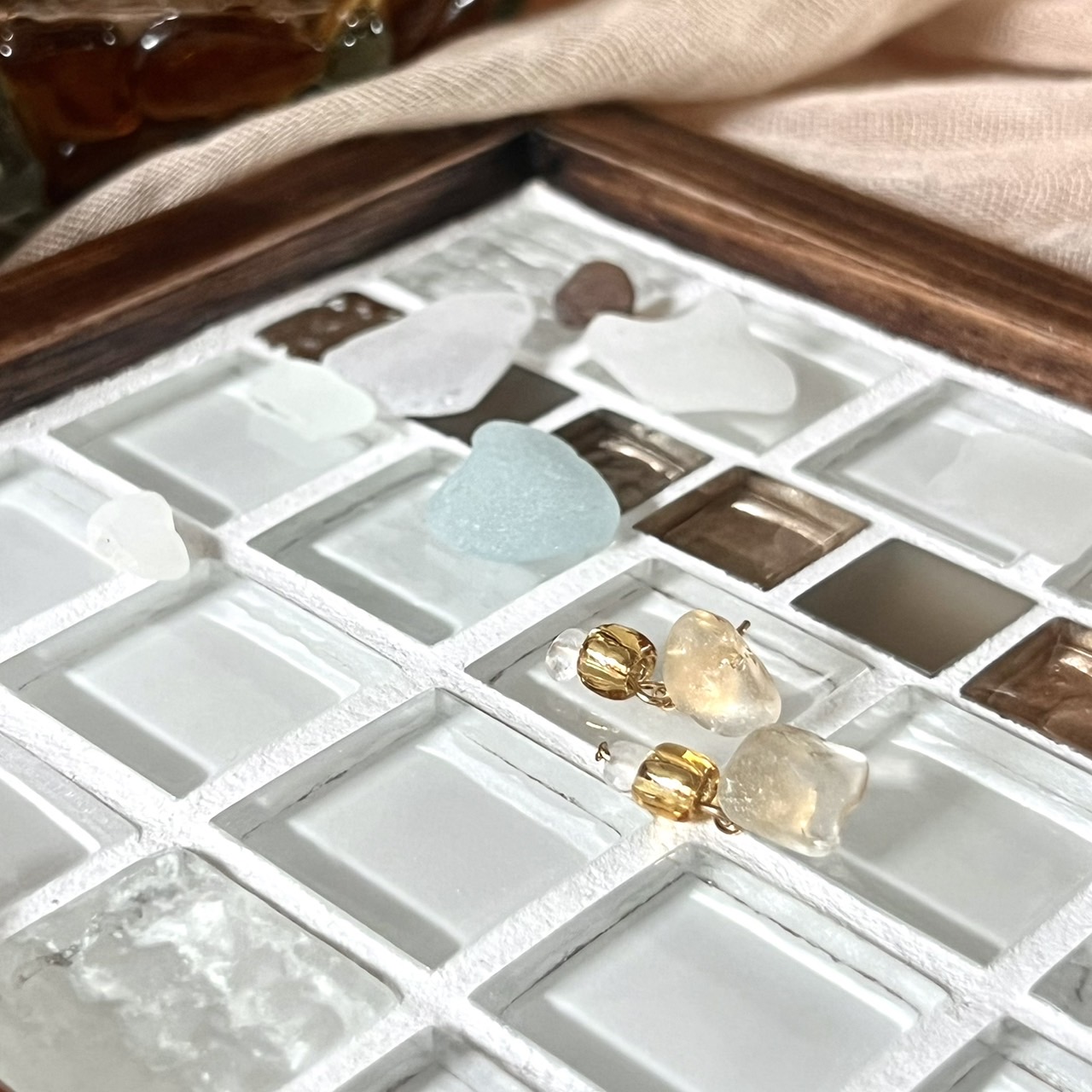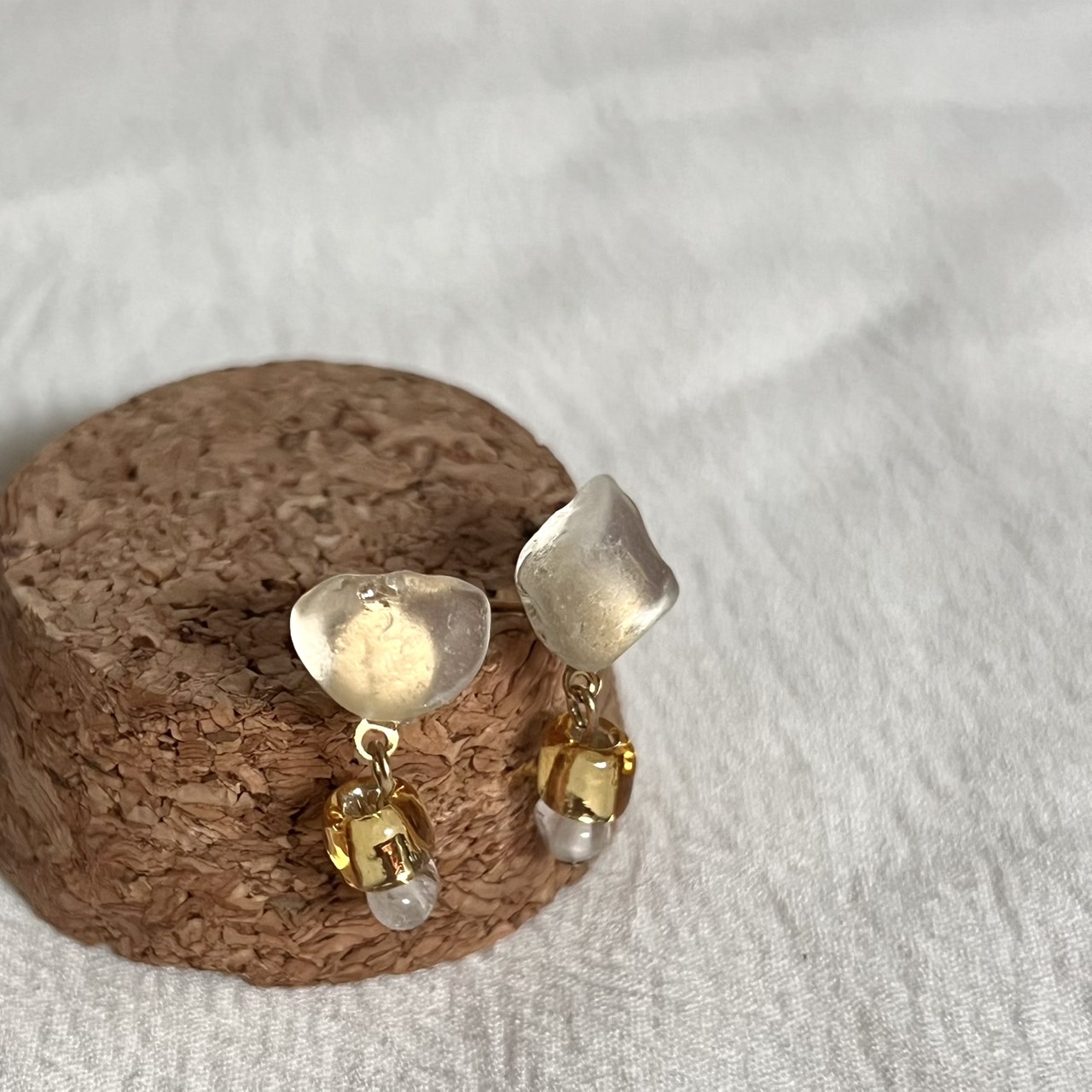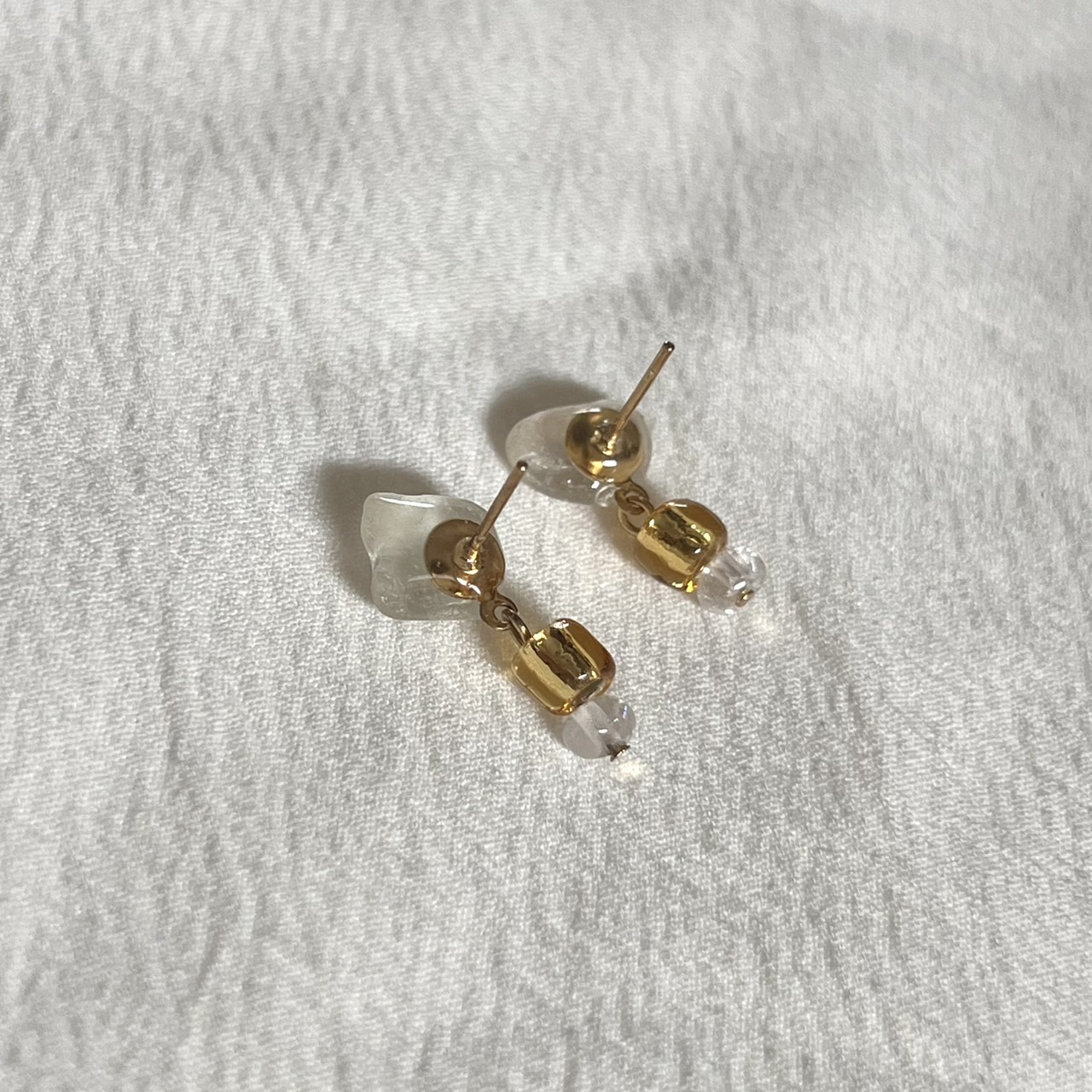 波雫(なみしずく) – Wave Drops|一点ものシーグラスピアス(gold × white)・ガラス&クリスタルの海色アクセサリー